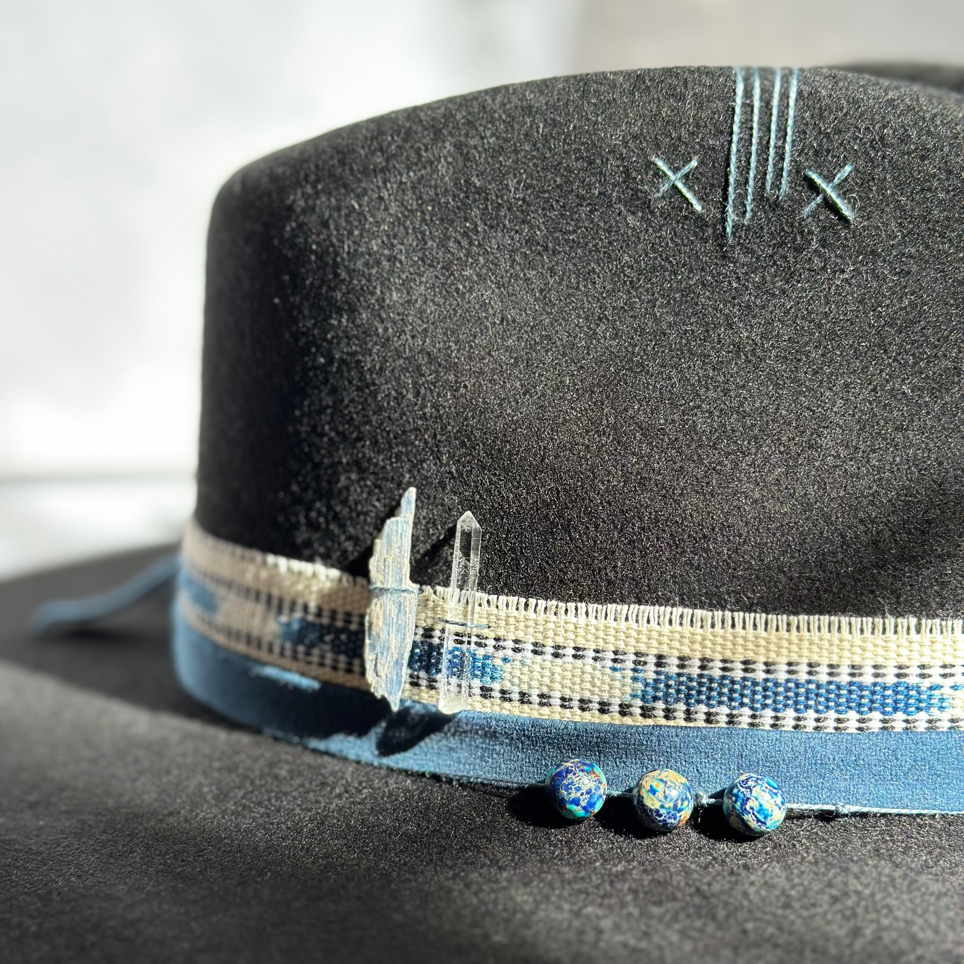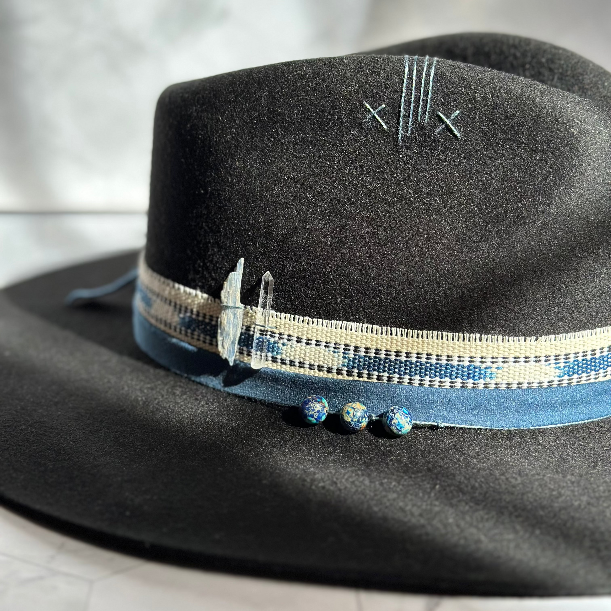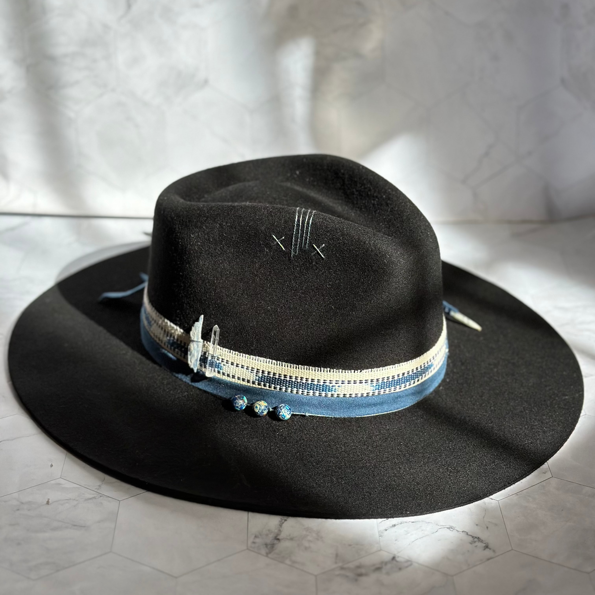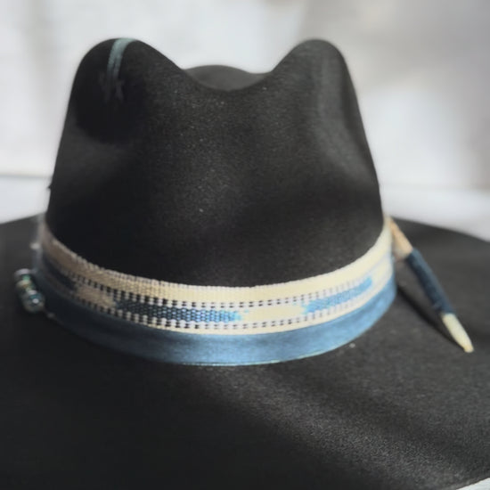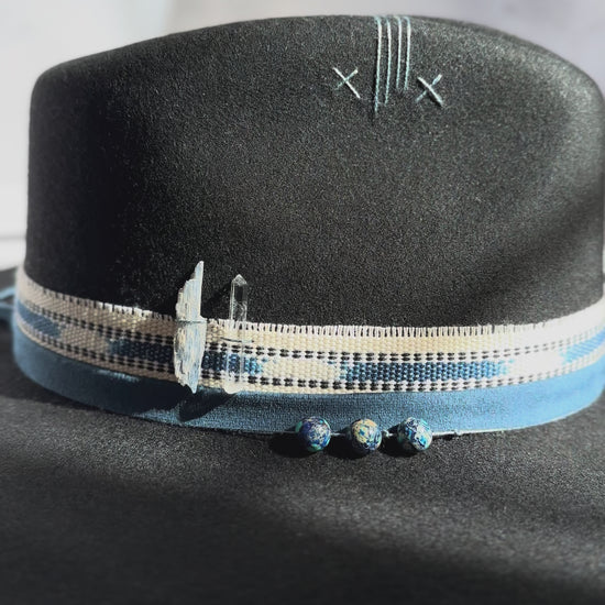 A striking black fedora adorned with deep blue stones and sacred Guatemalan textiles.