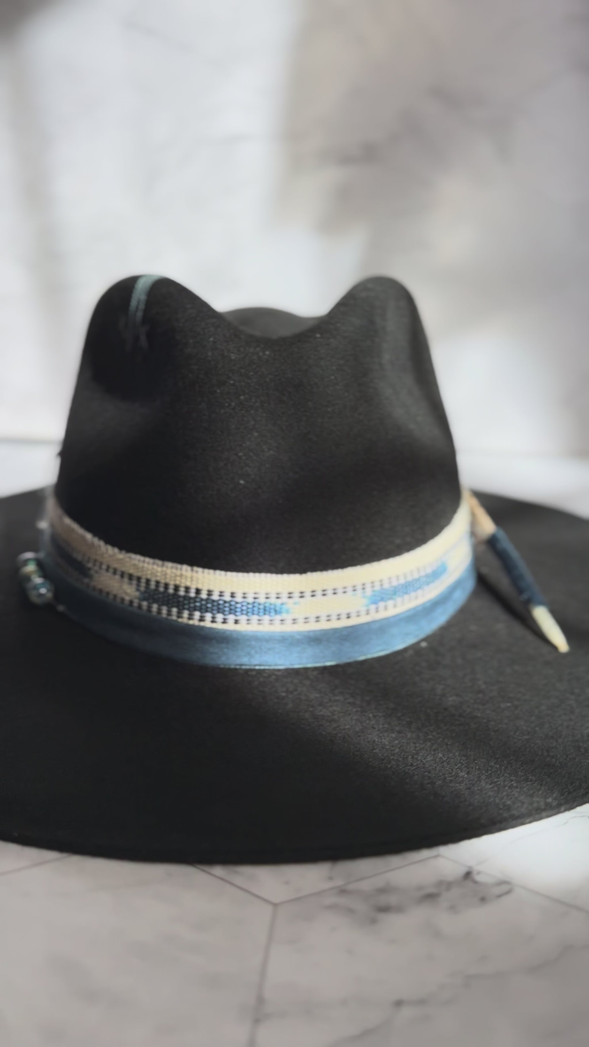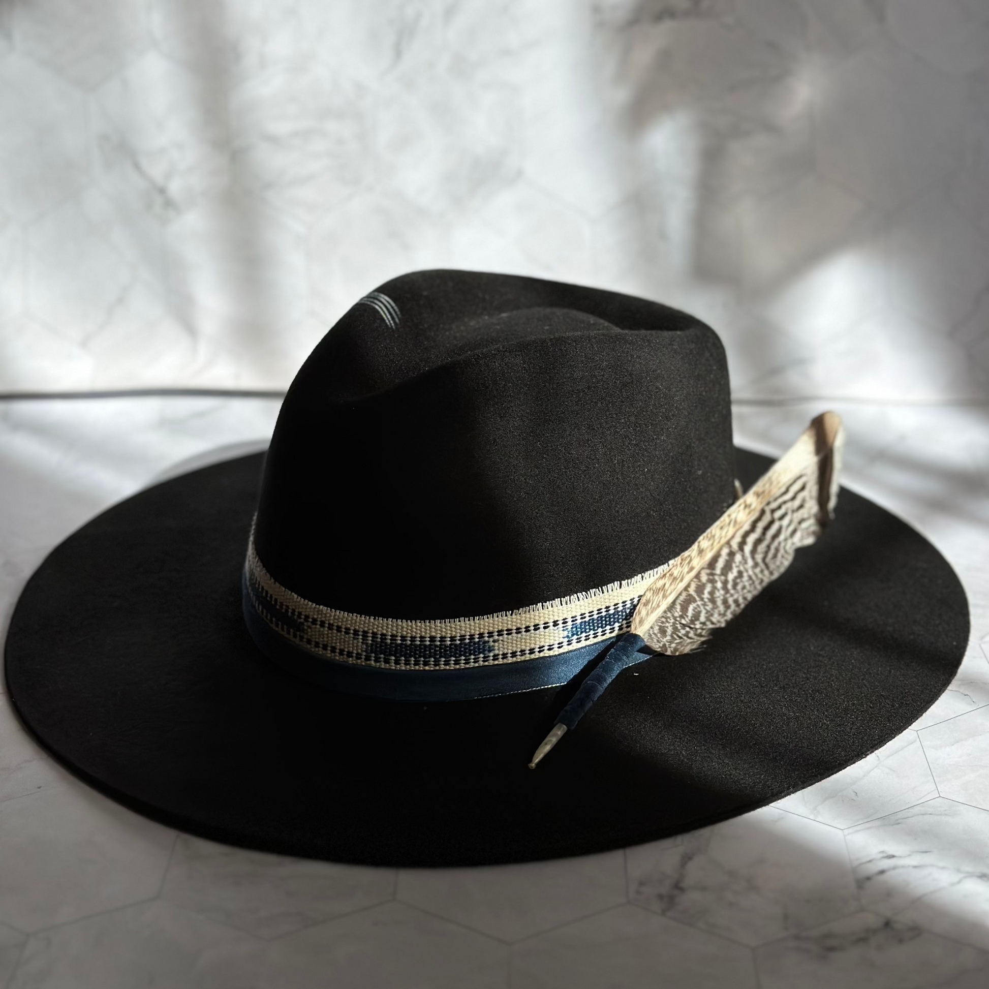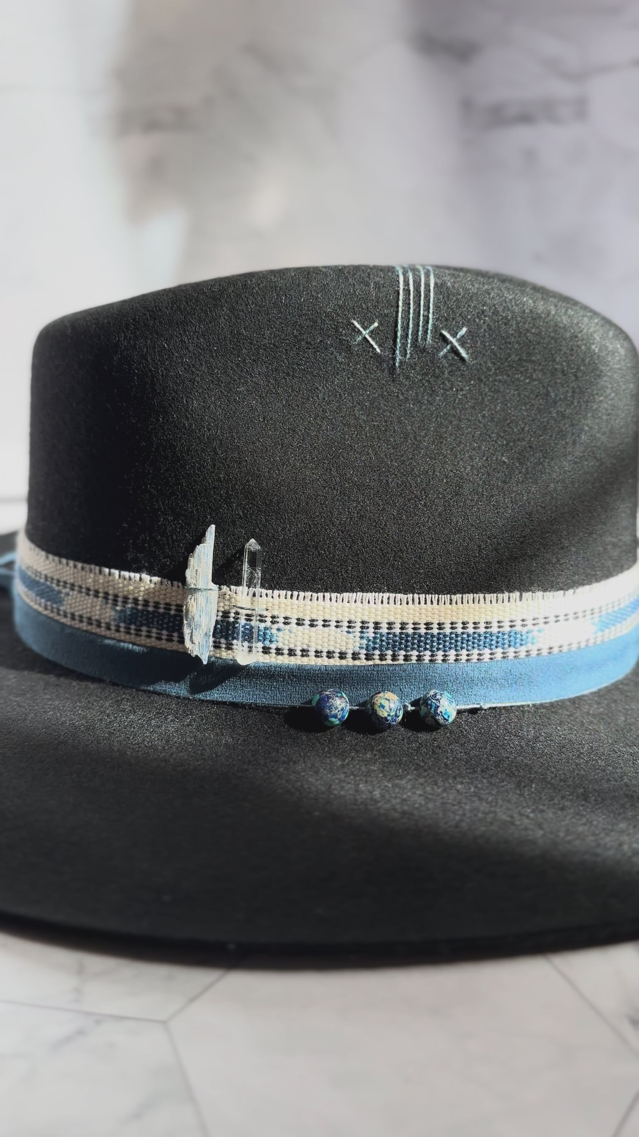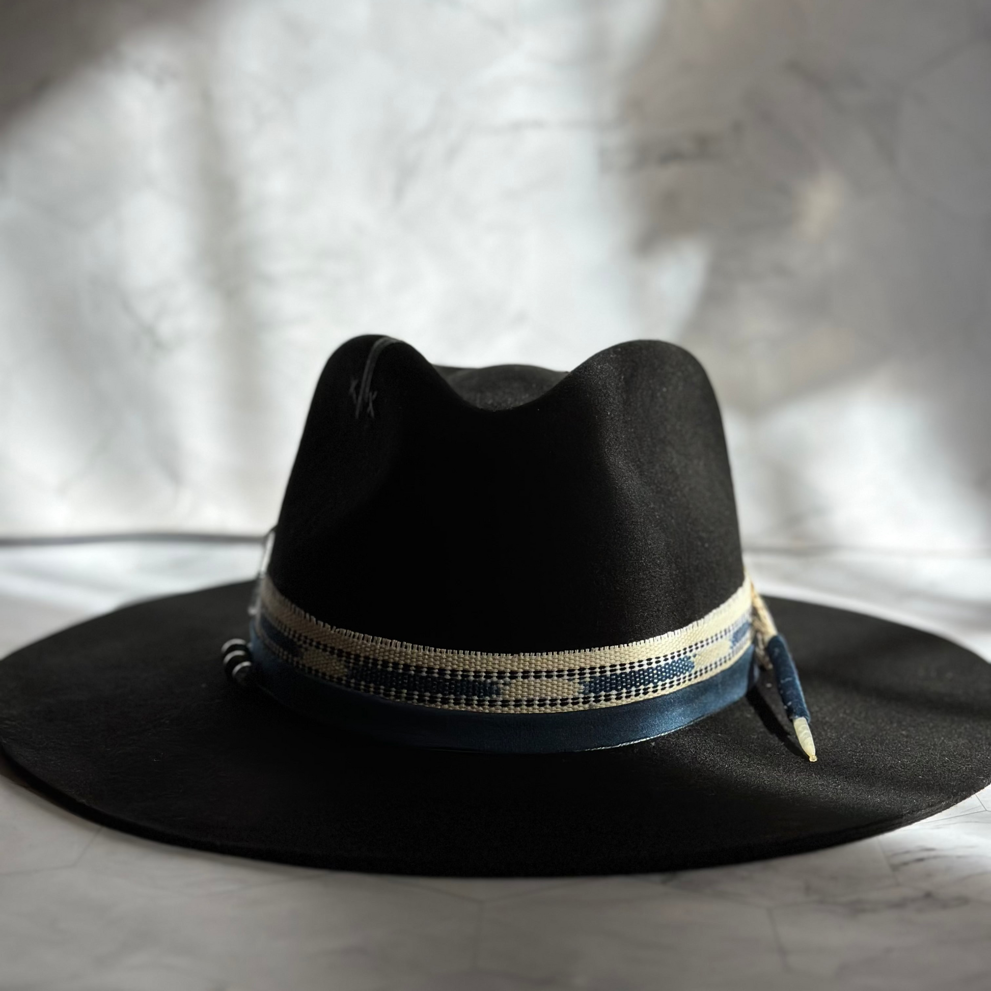 A striking black fedora adorned with deep blue stones and sacred Guatemalan textiles.