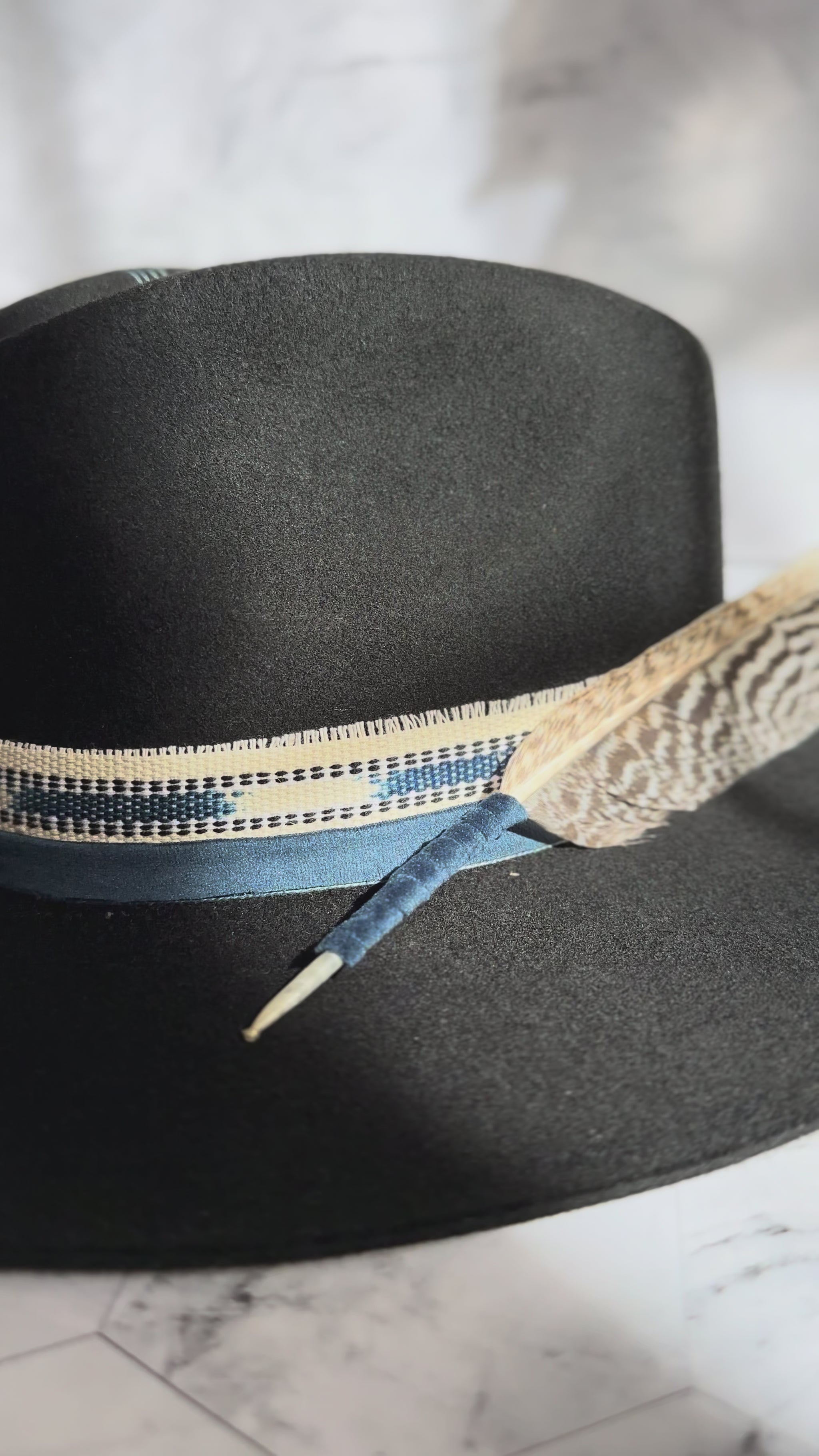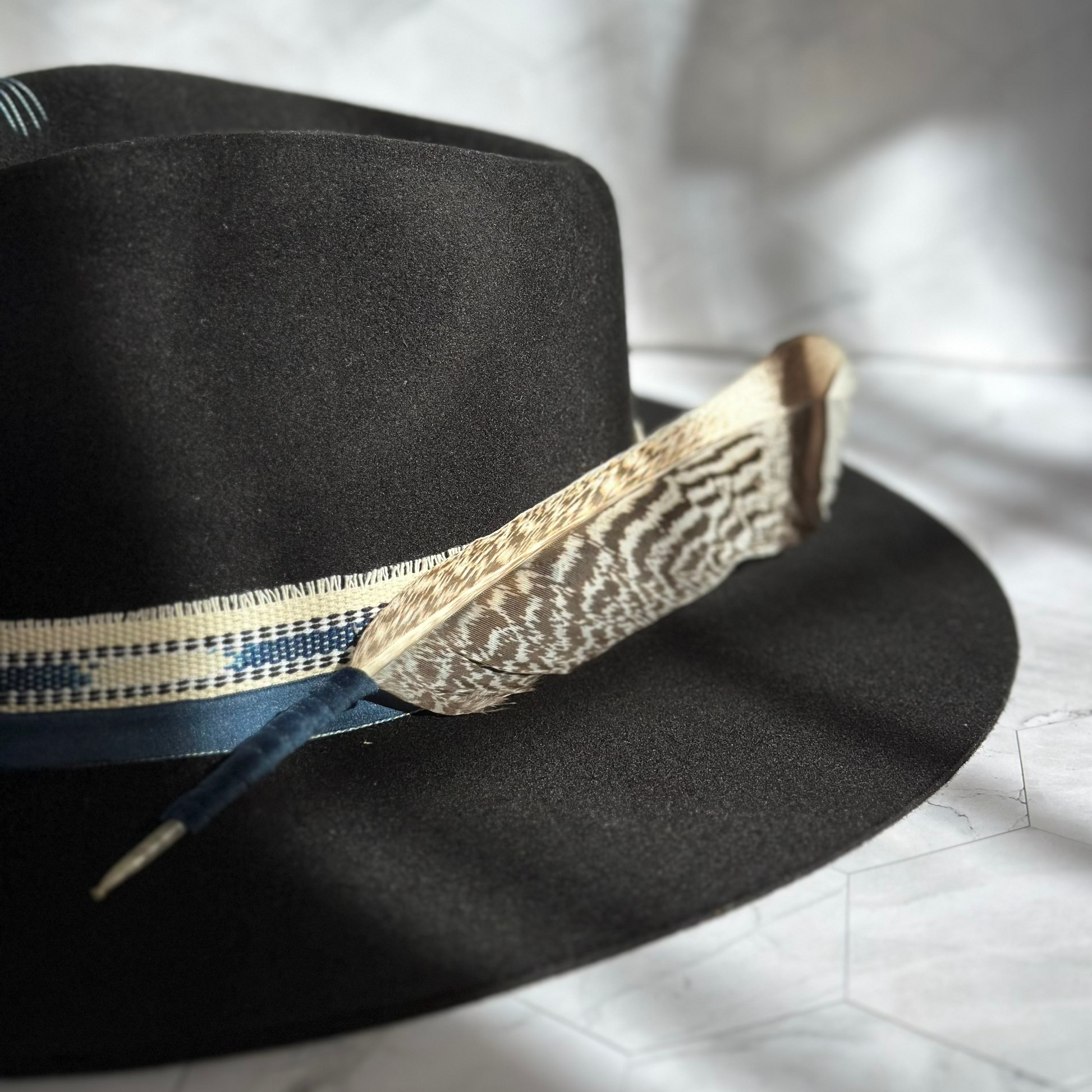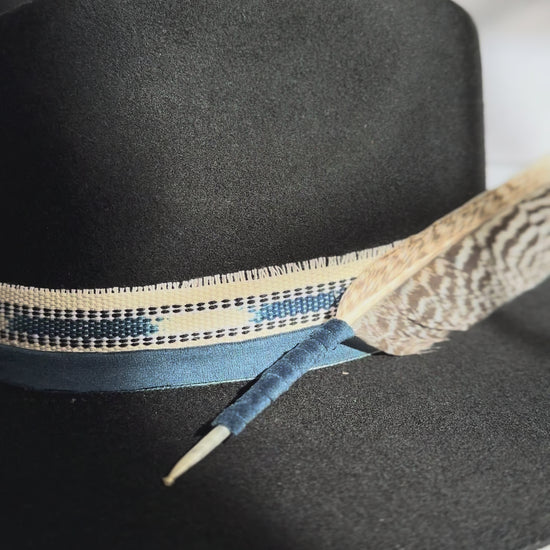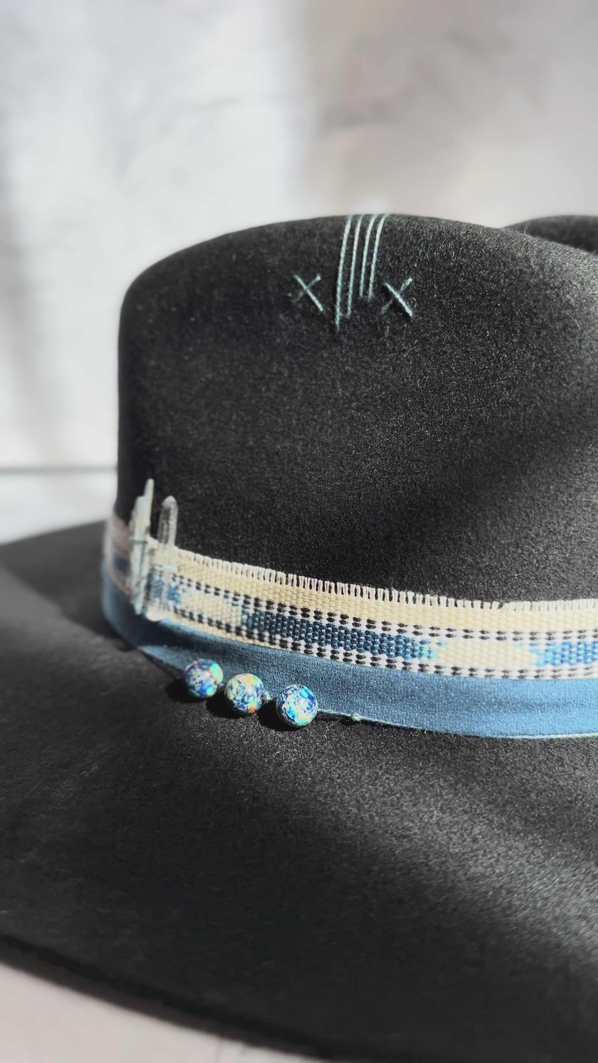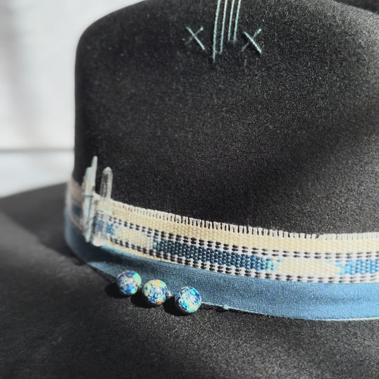 A striking black fedora adorned with deep blue stones and sacred Guatemalan textiles.