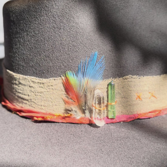 A wanderer's companion crafted in soft gray wool with vintage textiles and jungle treasures.